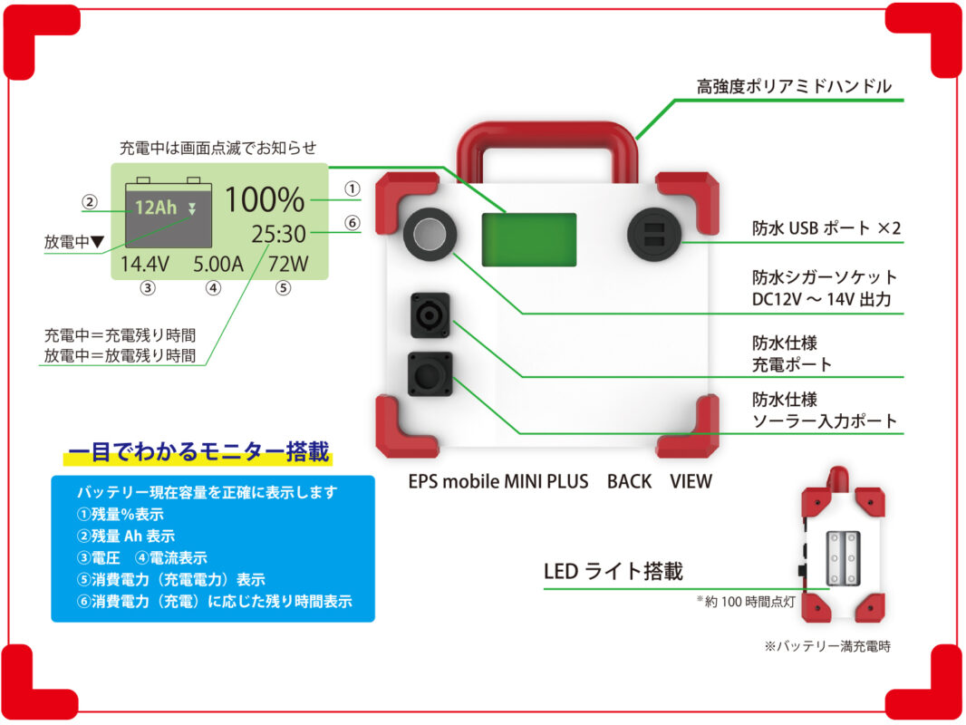 | 保護回路 | セルバランス・過負荷・過温度・バッテリー低電圧・高電圧保護・短絡保護 |